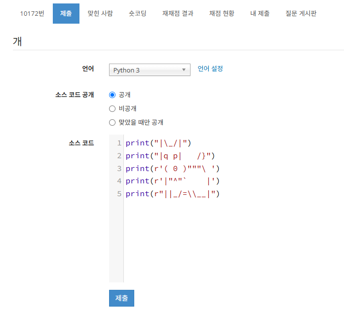 1. print 출력 시 유의해야될 특수문자들이 있어 \(백슬래시)는 뒤에 있는 문자를 이스케이프 문자로 인식 시켜주기 때문에 \" 는 에러가 나기 때문에 문자 그대로 \(백슬래시)를 나타내주고 싶다면 \\ 이렇게 진행을 하면됩니다.
