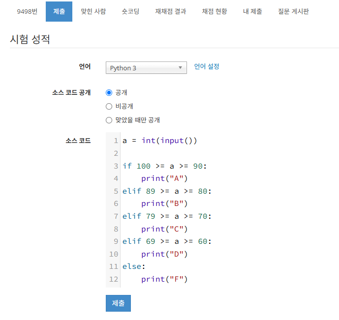 - elif : 69 >= a >= 60 : 69 랑 같으면서 큰 수 >= a >= 60이랑 같으면서 큰 수