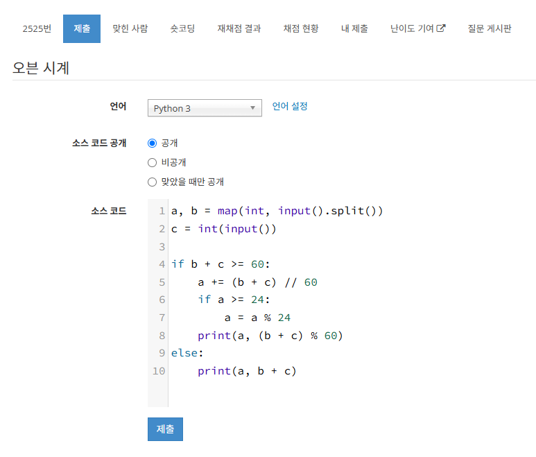 - print() : 위의 계산해서 나온 a변수와 (b + c) % 60 : b + c를한 값을 60으로 나눴을 때 나온 나머지값 출력