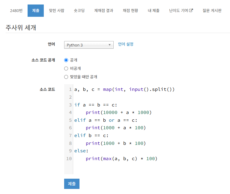 3개 주사위의 나온 눈이 주어질 때, 상금을 계산하는 프로그램을 작성 하시오.