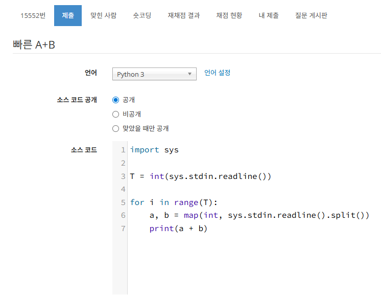 또한 입력과 출력 스트림은 별개이므로, 테스트케이스를 전부 입력받아서 저장한 뒤 전부 출력할 필요는 없다. 테스트케이스를 하나 받은 뒤 하나 출력해도 된다.