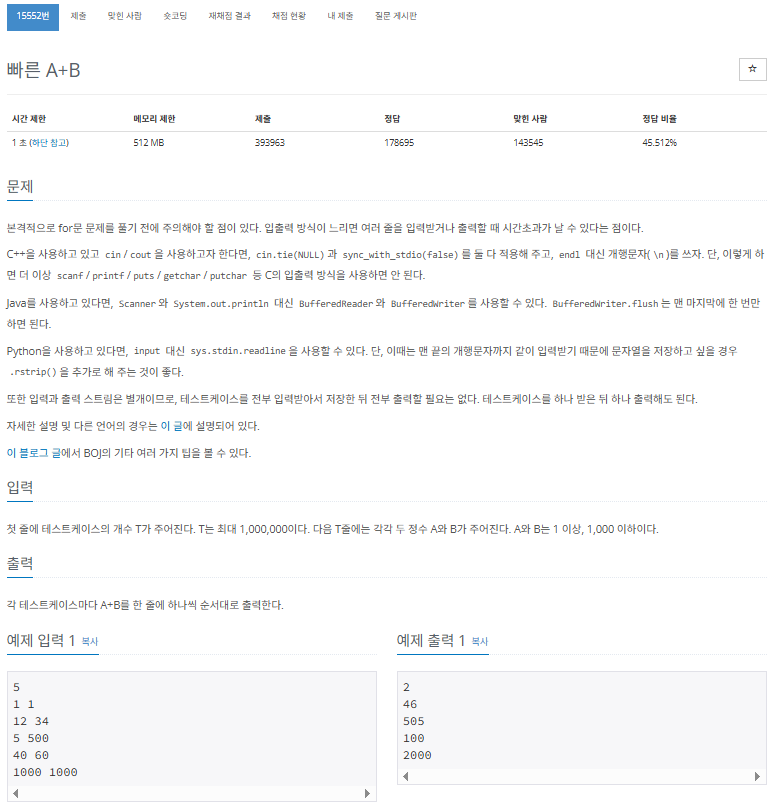 본격적으로 for문 문제를 풀기 전에 주의해야 할 점이 있다. 입출력 방식이 느리면 여러 줄을 입력받거나 출력할 때 시간초과가 날 수 있다는 점이다.